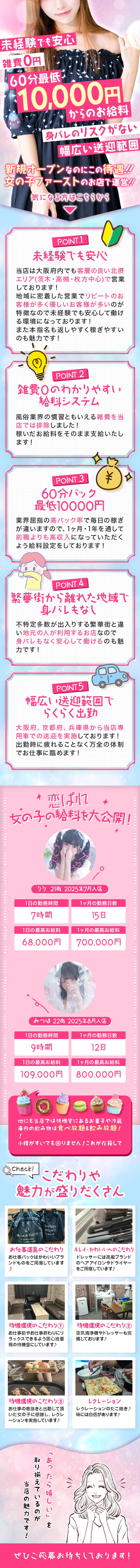 茨木枚方高槻のデリヘル【恋色ぱれっと】です。【未経験歓迎】【経験者優遇】【客層の良いエリア】【雑費なし】【広範囲の送迎】経験豊富なスタッフがしっかりサポート致します♪